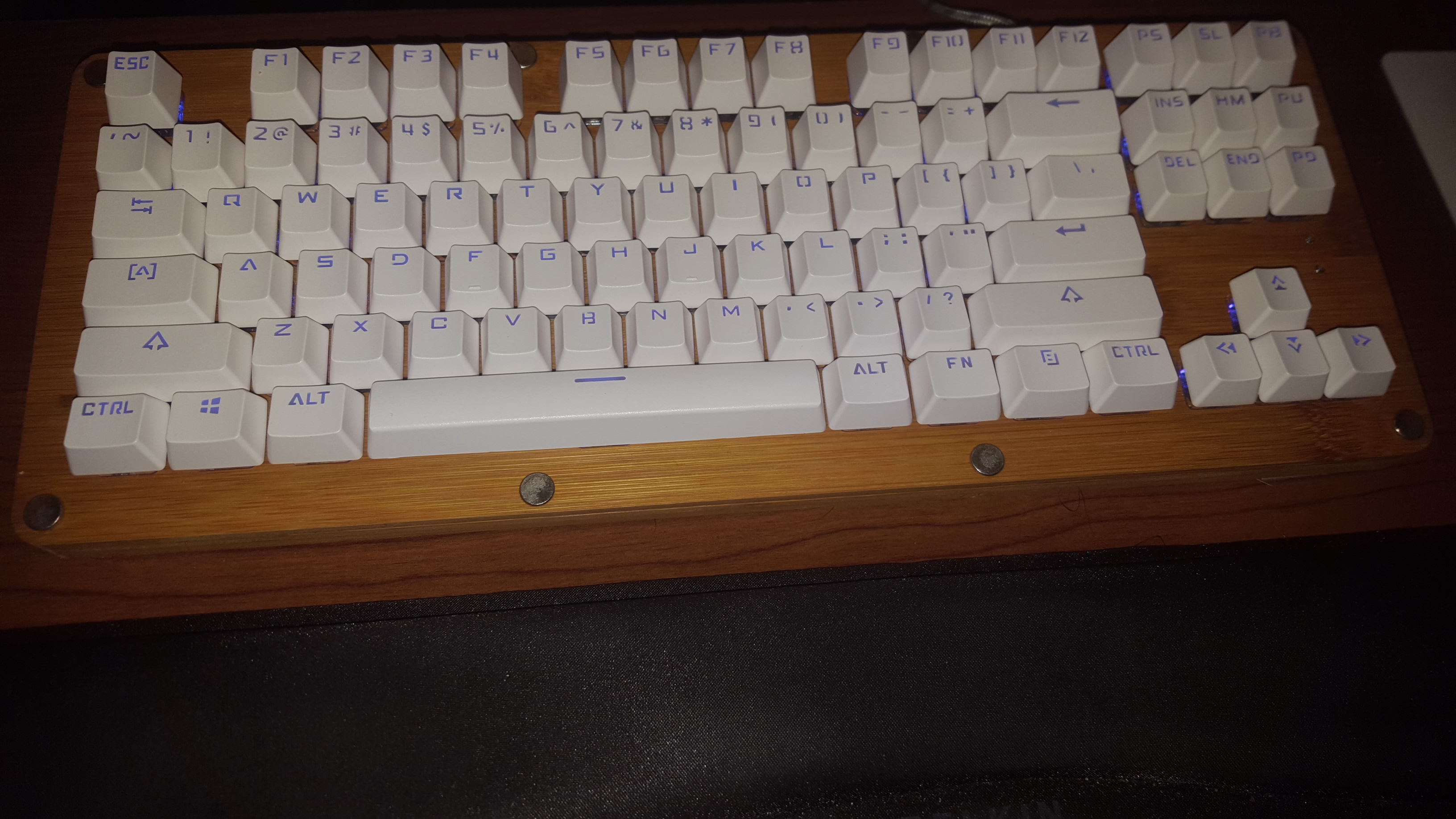 This keyboard was obtained through a group buy (limited to approximately 10 testers) facilitated by /u/XMIT (Jose) on Deskthority. The keypress action is very smooth. The actuation force feels lighter than the listed 70g, but feels nice. The sliders are a bit loud, but will be replaced with an updated iteration in the future. The keycaps have a slight texture to them. The PCB is waterproofed, but since this example has a bamboo case, exposure to water should be limited. XMIT worked with the vendor to make revisions to this board before it was made available in a subsequent group buy on MassDrop, where it sold more than 1,000 units.