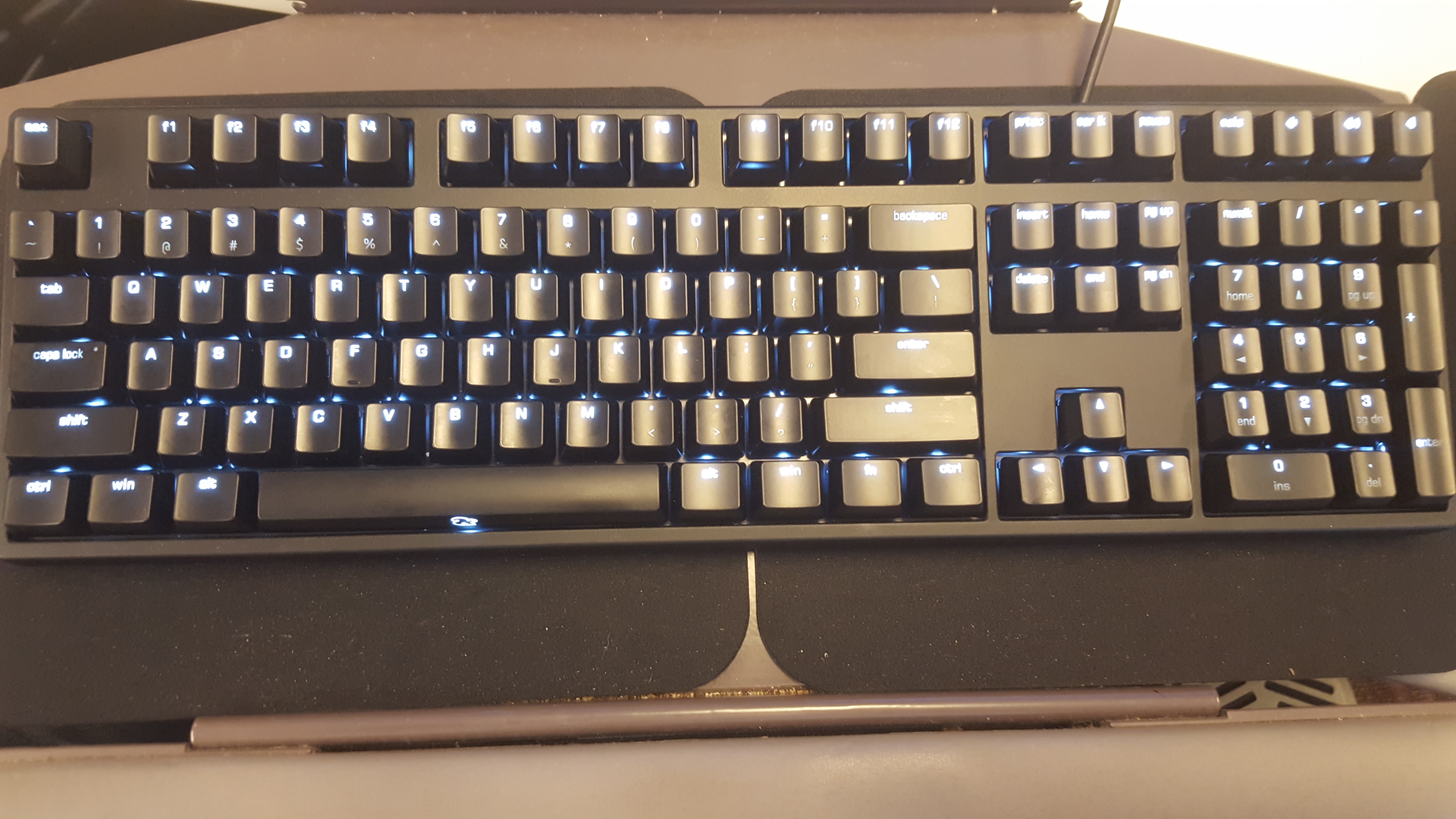 This KBT Vortex ONE features white LED backlighting and has MX Tactile Grey switches. While the 80g actuation force can be felt when typing, the switches activate early into the keypress, so it is possible to type without bottoming out — which also reduces the accompanying pinging sound.