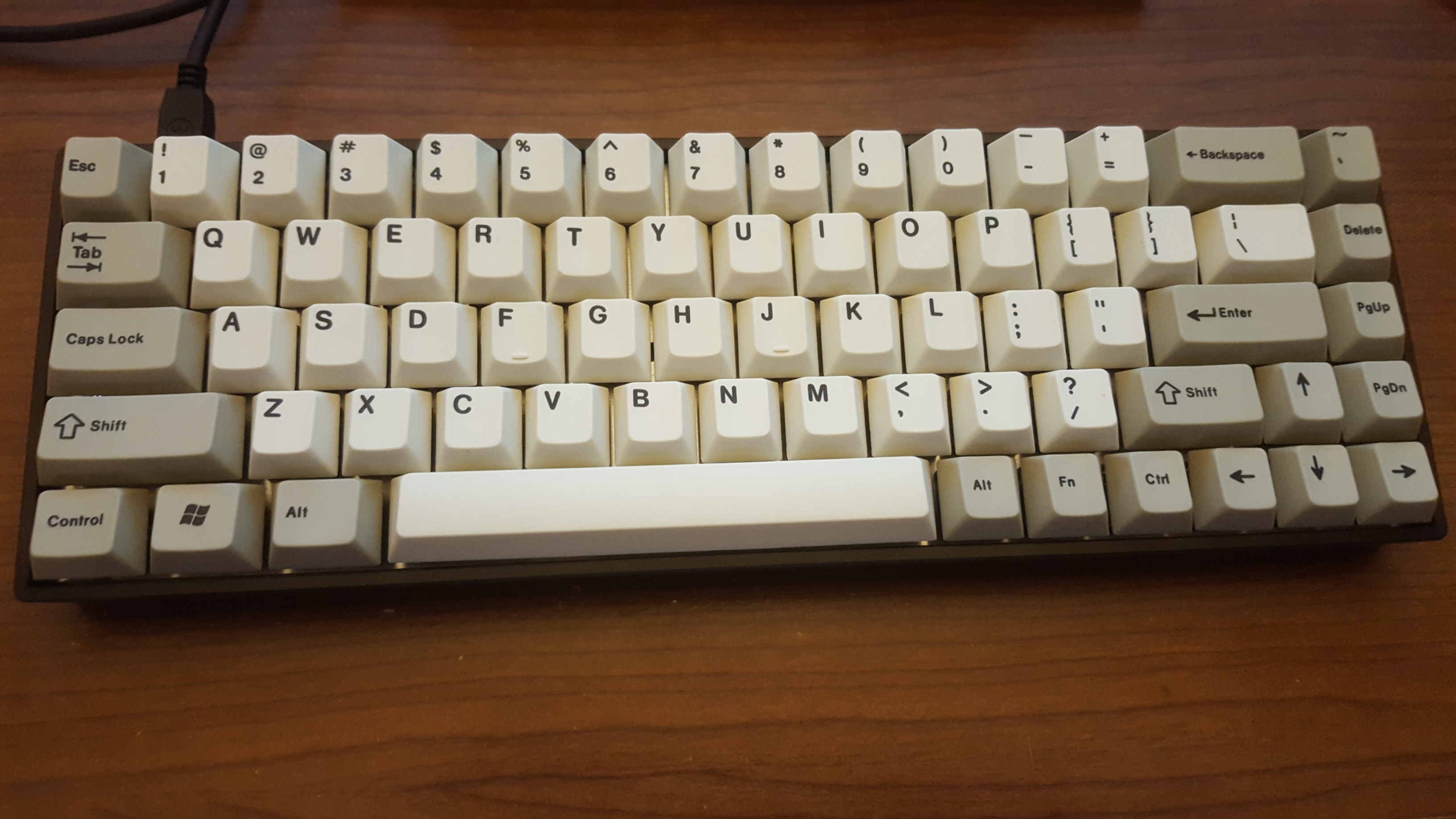 The TADA68 is programmable 65% keyboard that ships with a steel plate, angled case with side LED under-lighting, and PBT keycaps. This example has Gateron Green switches — which are crisper than MX Greens — and feel great beneath the thick PBT keycaps. My keyboard does not have in-switch LEDs.