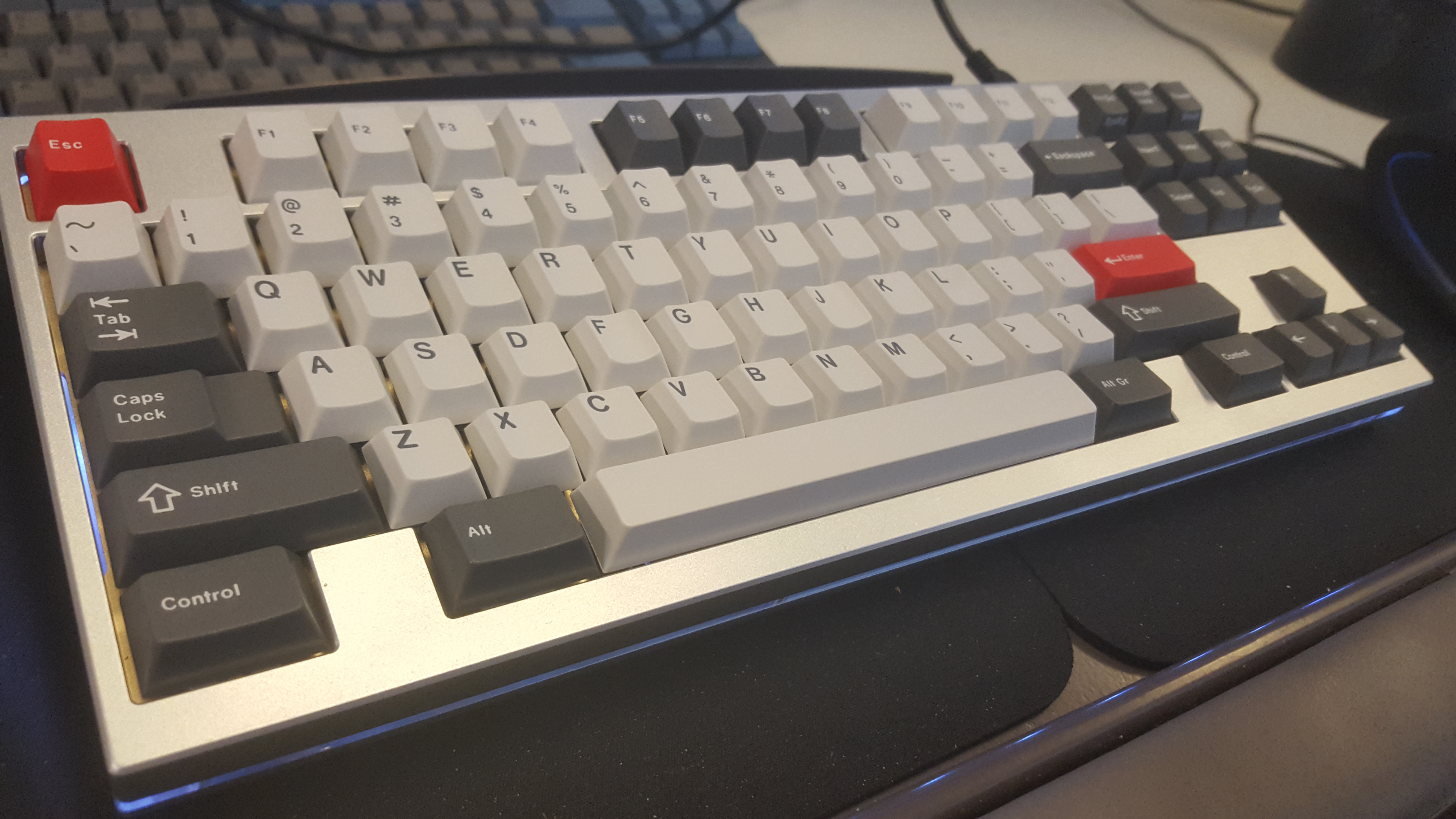 This board is the heaviest, modern custom keyboard in my collection. Typing on it feels incredible. The board being so firmly planted allows you to really experience the switches and keycaps on a heightened level. The LED light emitted from the middle layer is the perfect finishing touch for an exquisite typing experience.